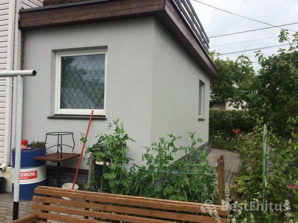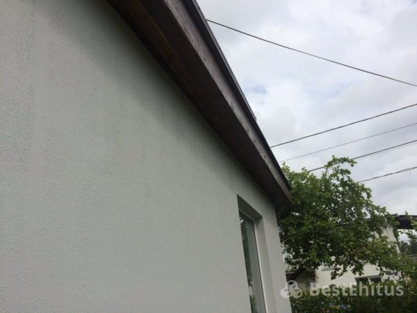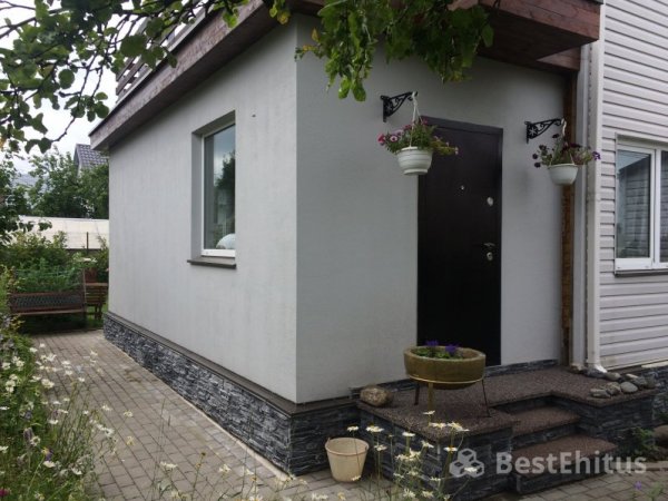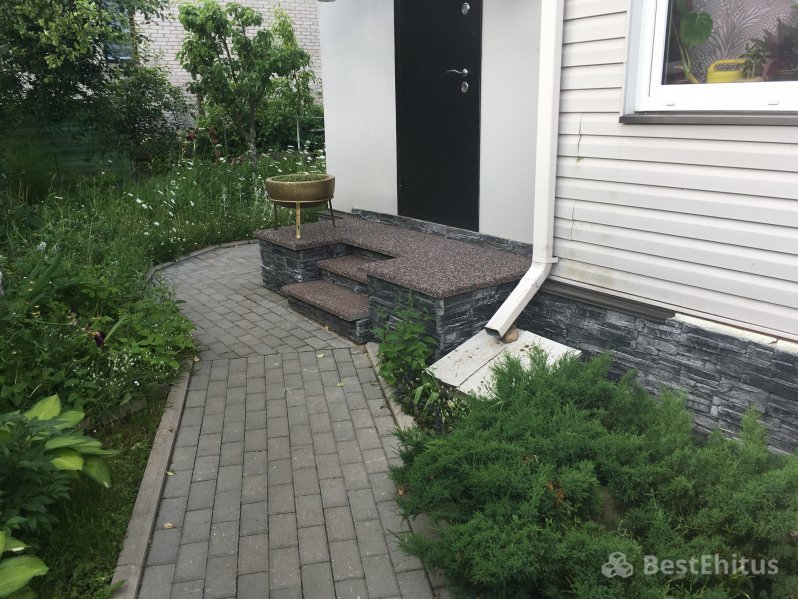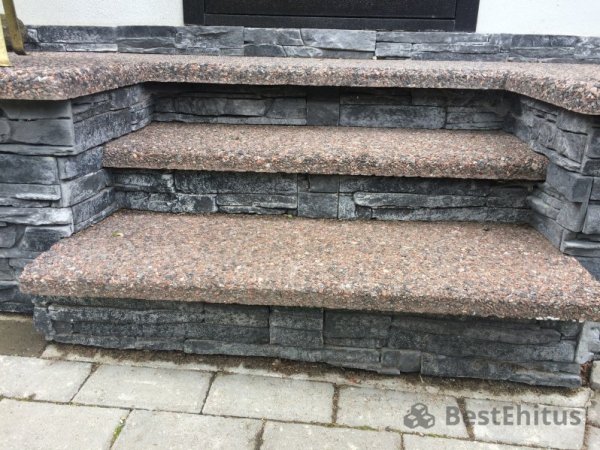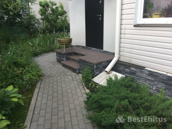 В данном объекте нами была уложена тротуарная плитка и изготовлено крыльцо к дому. На поверхность крыльца уложен прочный и красивый гранитный камень. Боковая отделка крыльца и цоколя дома - декоративный камень. Само помещение отделано термо краской снаружи, в результате чего, по словам владельца, в помещении стало намного теплее. Подробнее о термо краске можете прочитать в нашей статье ЗДЕСЬ