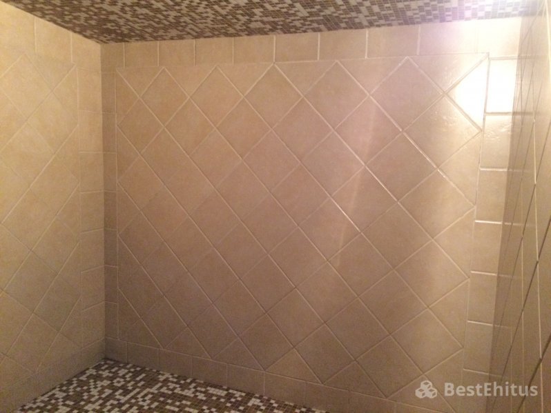 Произведены работы по строительству межкомнатных перегородок, укладка керамической плитки, установка сантехники и проводка водоснабжения, строительство паровой бани (хамам) с тёплыми стенами и сидениями. Укладка керамической плитки произведена ромбовидным методом. На стенах бассейна плитка укладывалась методом "ёлочка".