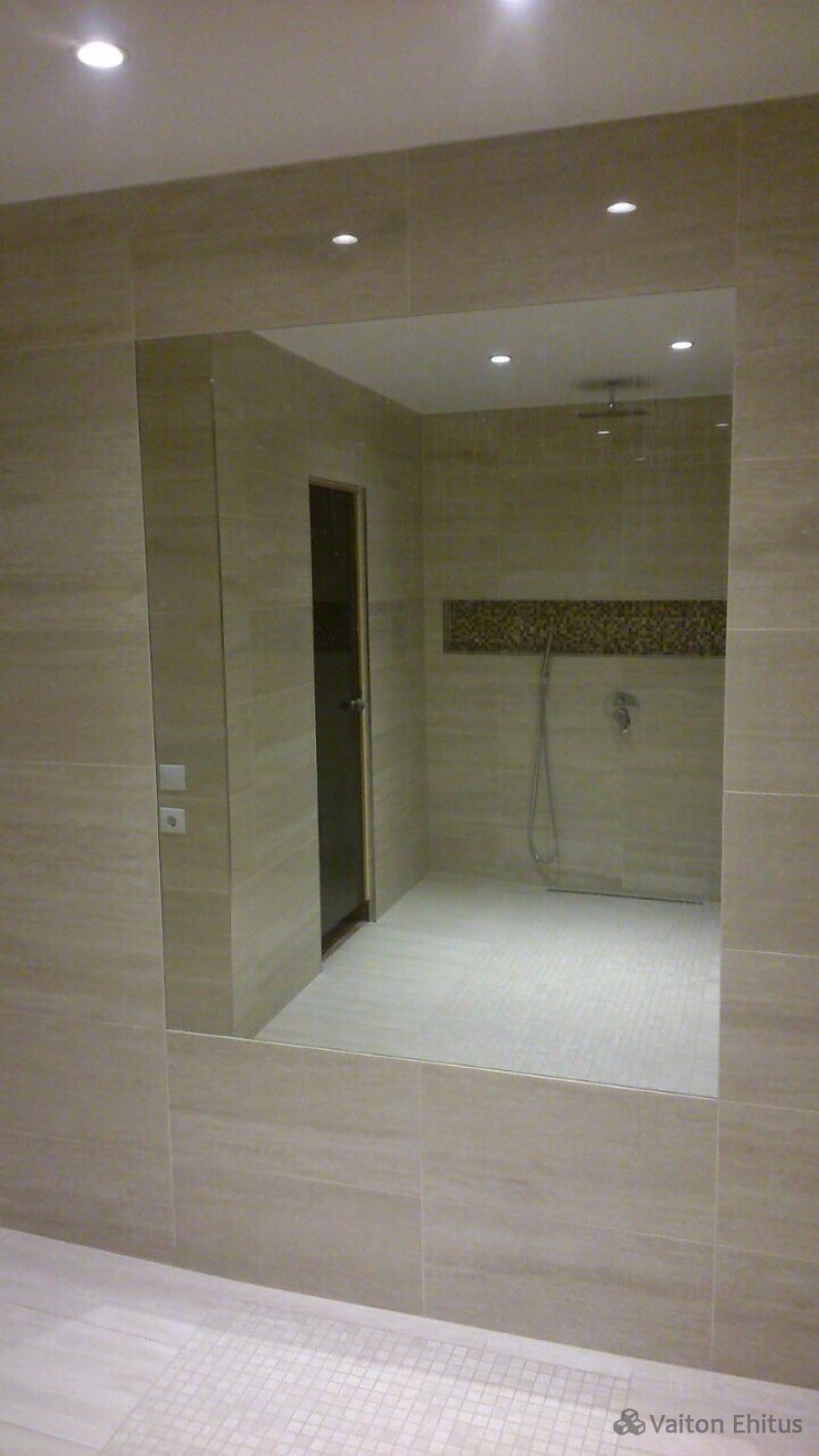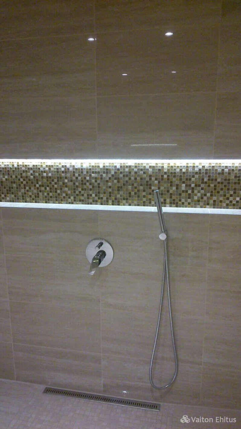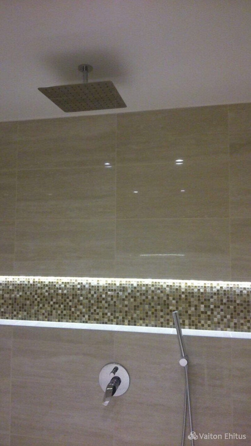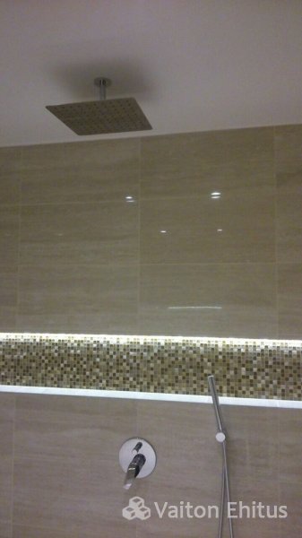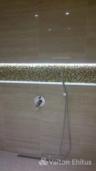 В ходе проекта стены душевой комнаты были обшиты кафельной плиткой по проекту заказчика со встроенной декоративной подсветкой в керамическом канте в стене. Установлены все необходимые водяные коммуникации в душевой.