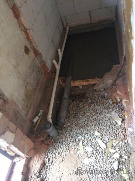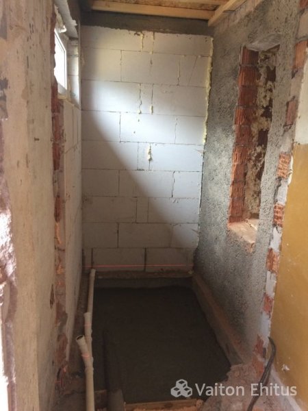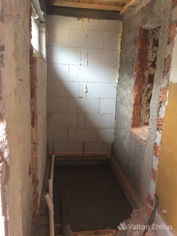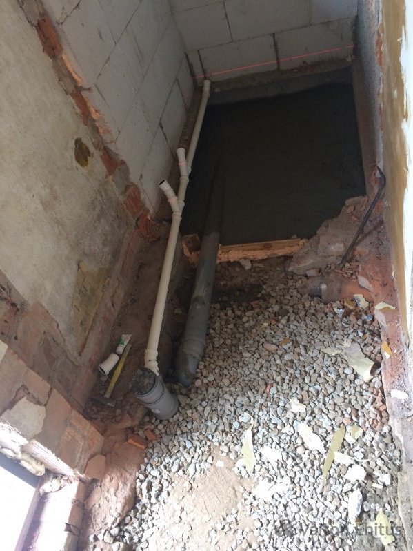 В проекте была сделана кладка из пенобетонных блоков, установлена перегородка из гипсокартонных плит с дверью. В полу были установлены все необходимые трубы для отвода и подачи воды. Полы залиты с уложенными перед заливкой трубами "тёплого пола" методом улитка.