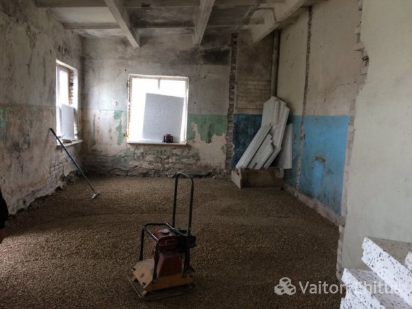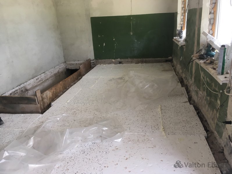 В работы было выровнено основание пола щебнем, поверх щебня уложен утеплитель с армированием всей площади. На конечном этапе происходила заливка основания пола бетонном с последующей его шлифовкой. Так называемая заливка полов бетоном "под вертолёт".