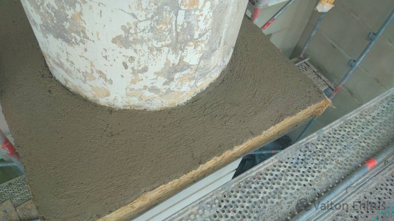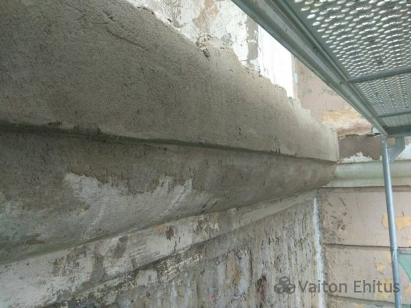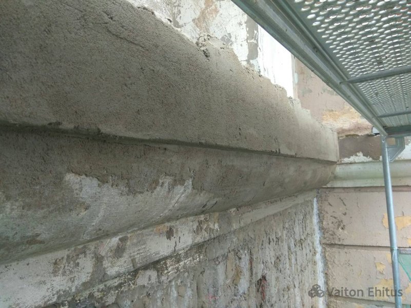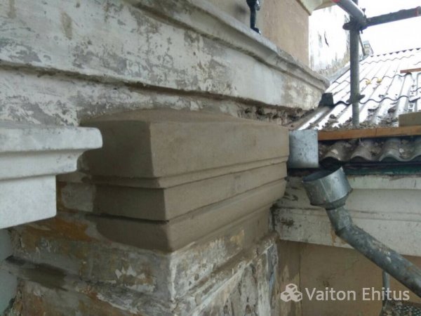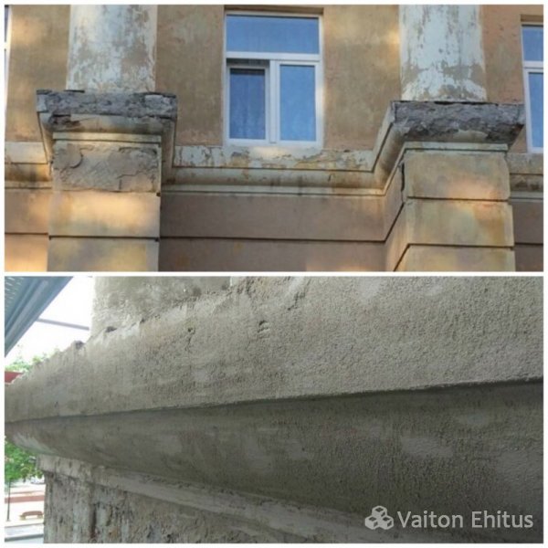 Все трещины были зафиксированны документально и заверены. Трещина в несущей конструкции была раскрыта, заложена специальным раствором и обжата скобами. Все выступающие части фасада, которые частично были разрушены и утратили свой архитектурный вид, были воссозданы и укреплены специальным выравнивающим раствором. (фото ниже)