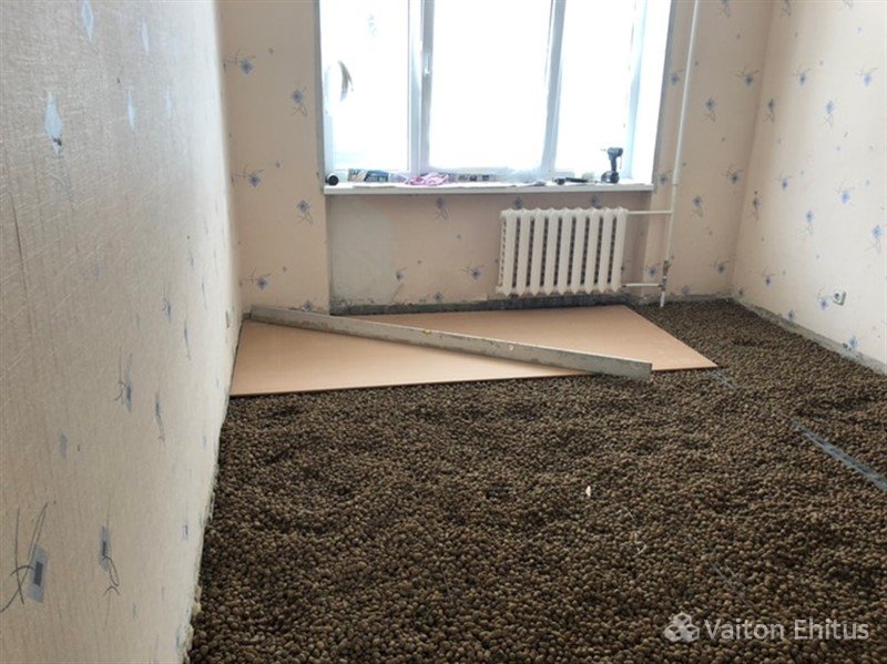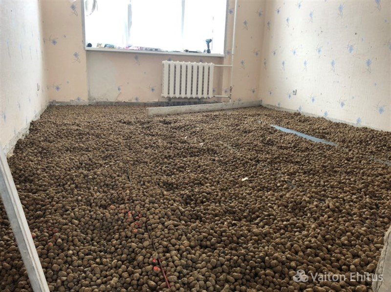 Поверх чистого полового покрытия (обычно в домах это бетонные перекрытия) укладывается и разравнивается керамзит. Предпочтительней укладывать керамзит мелкой фракции, в этом случае плотность увеличивается, а значит увеличивается тепло- и звукоизоляция.