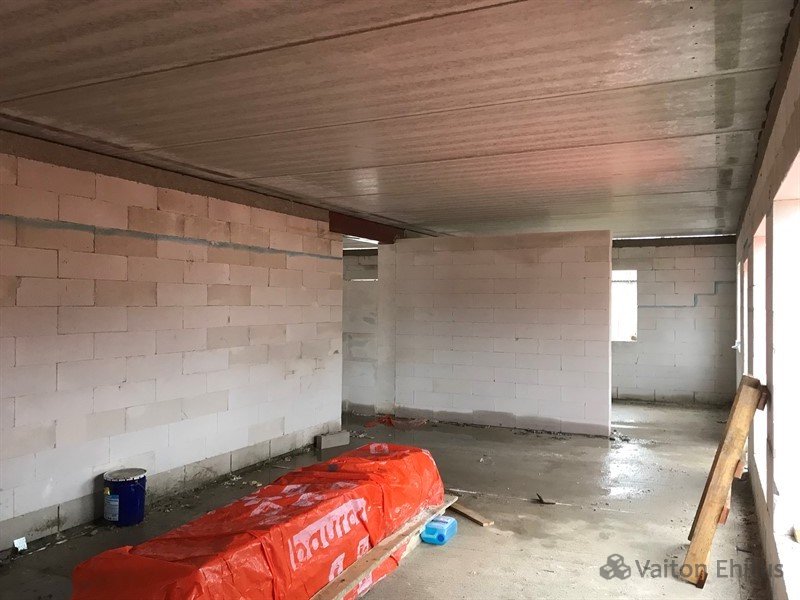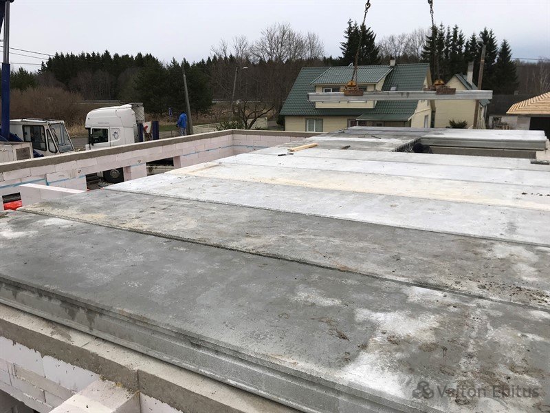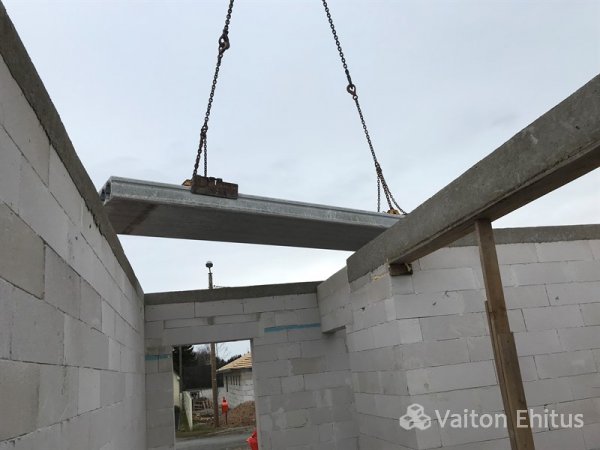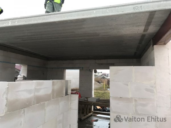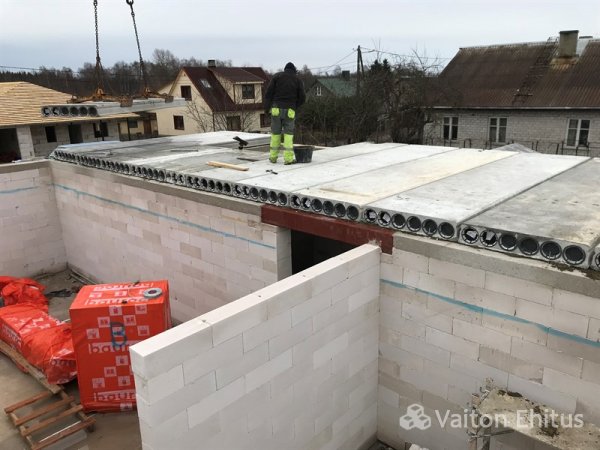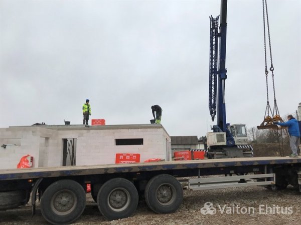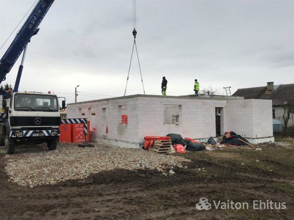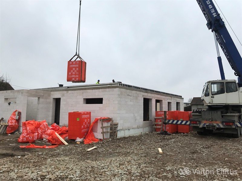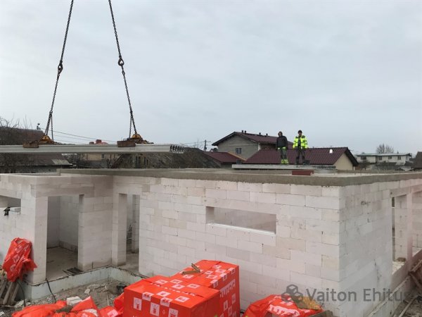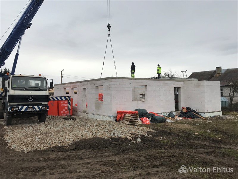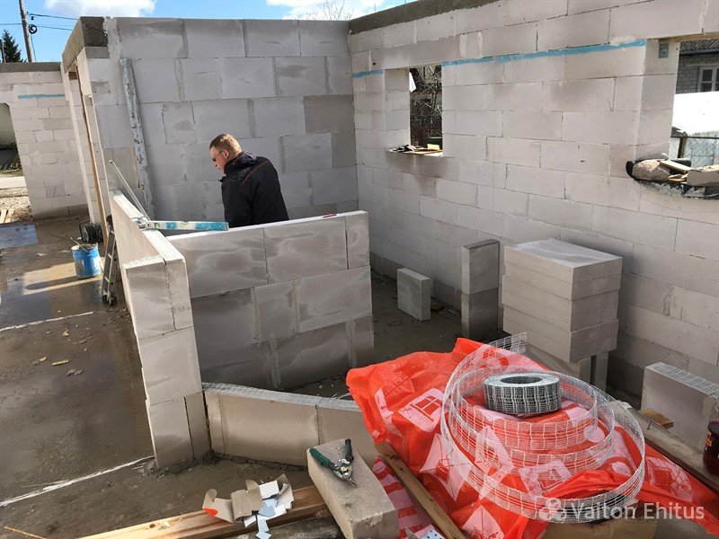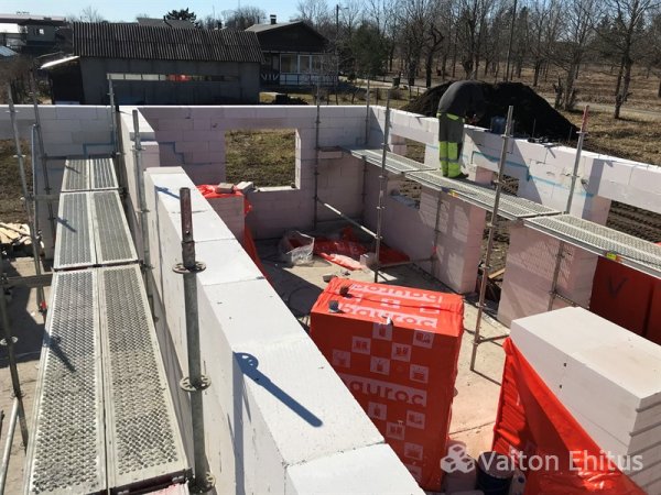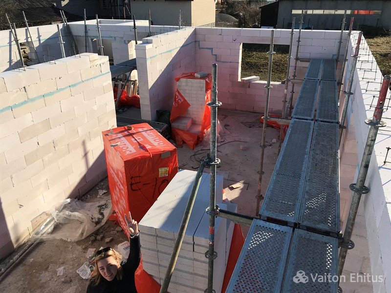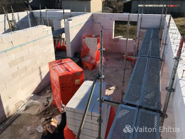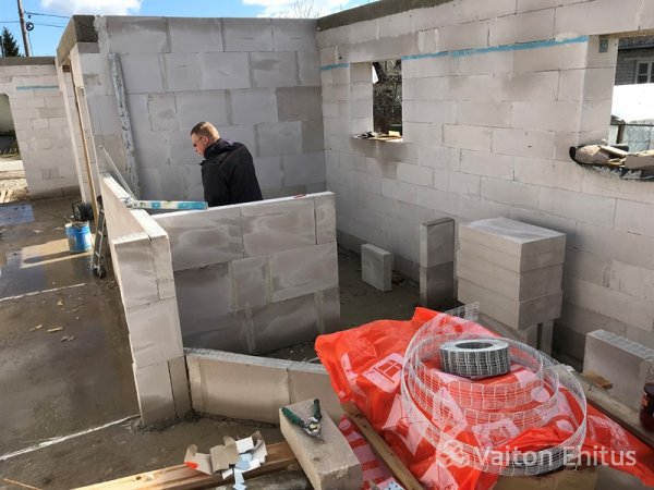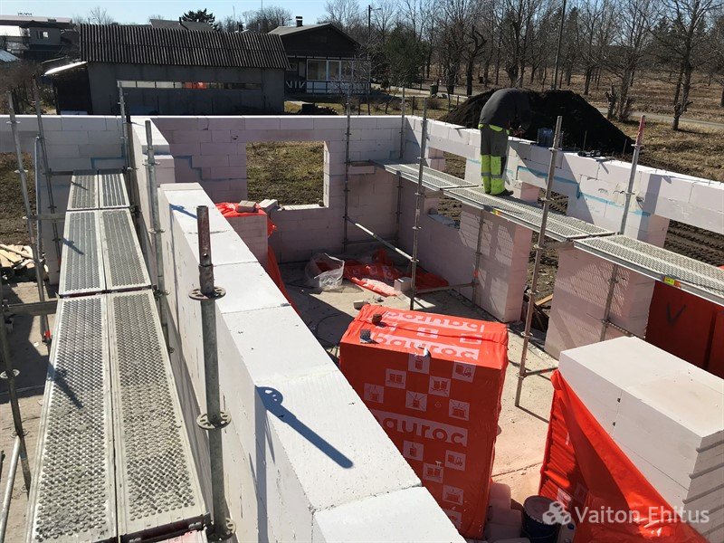После заливки фундамента и тёплого пола (публикация по строительству фундамента здесь), наша строительная компания Vaiton Ehitus приступила к укладке стен первого этажа из пеноблоков Aeroc. Публикация по укладке блоков здесь http://mail.vaitonehitus.eu/proekty/42-kladka-blokov-bauroc.html