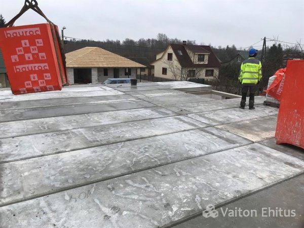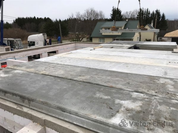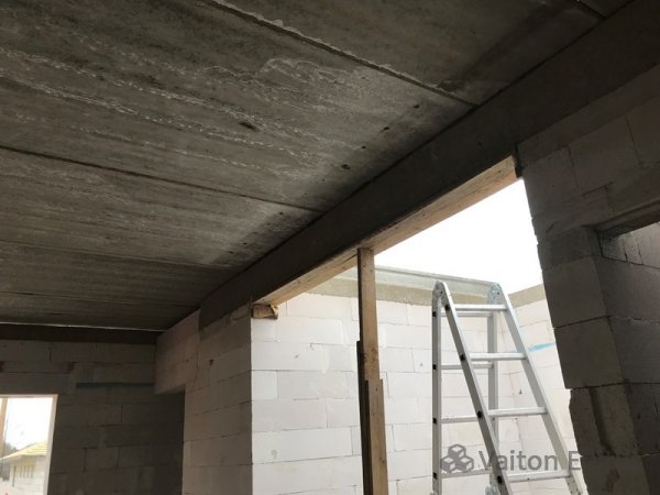 Первый этаж связали монолитным поясом, вместе с заливкой балки перекрытия под лестничный проём. Далее произвели укладку панелей перекрытий от компании BetoonElement.